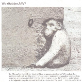 | Juli 2012 - Sommerrätsel Seit rund 50 Jahren hält unser kleine Affe mit seinem Kollegen von der zweiten Hauskante das Gebäude Hauptstraße 14 in Ehingen an seinem Platz. Und immer wieder sind die Zwei ein Blickpunkt und dieses Jahr sind sie Teil des Sommerrätsels der Lokalpresse. |