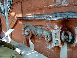 | Sommer 2004 Kirche Reinstetten. Restaurierung des Kirchturmes. Fotos vor und nach der Restaurierung. Die Wandpfeiler am Kirchturm sind mit üppigen Kapitellen aus grauem Sandstein geschmückt. Vor allem die auskragenden Voluten waren stark geschädigt. Sie mussten gesichert und teilweise ergänzt werden. Die Arbeiten wurden von Juli bis September 2004 ausgeführt und in einer umfangreichen Dokumentation festgehalten. |