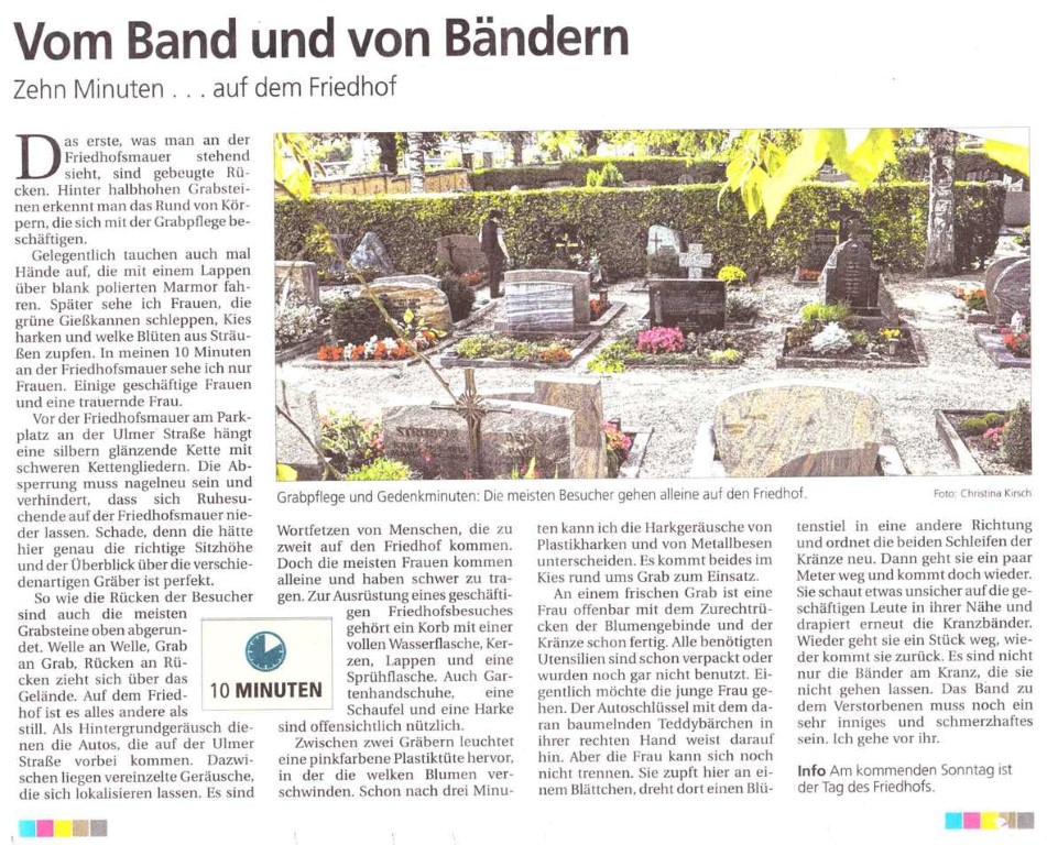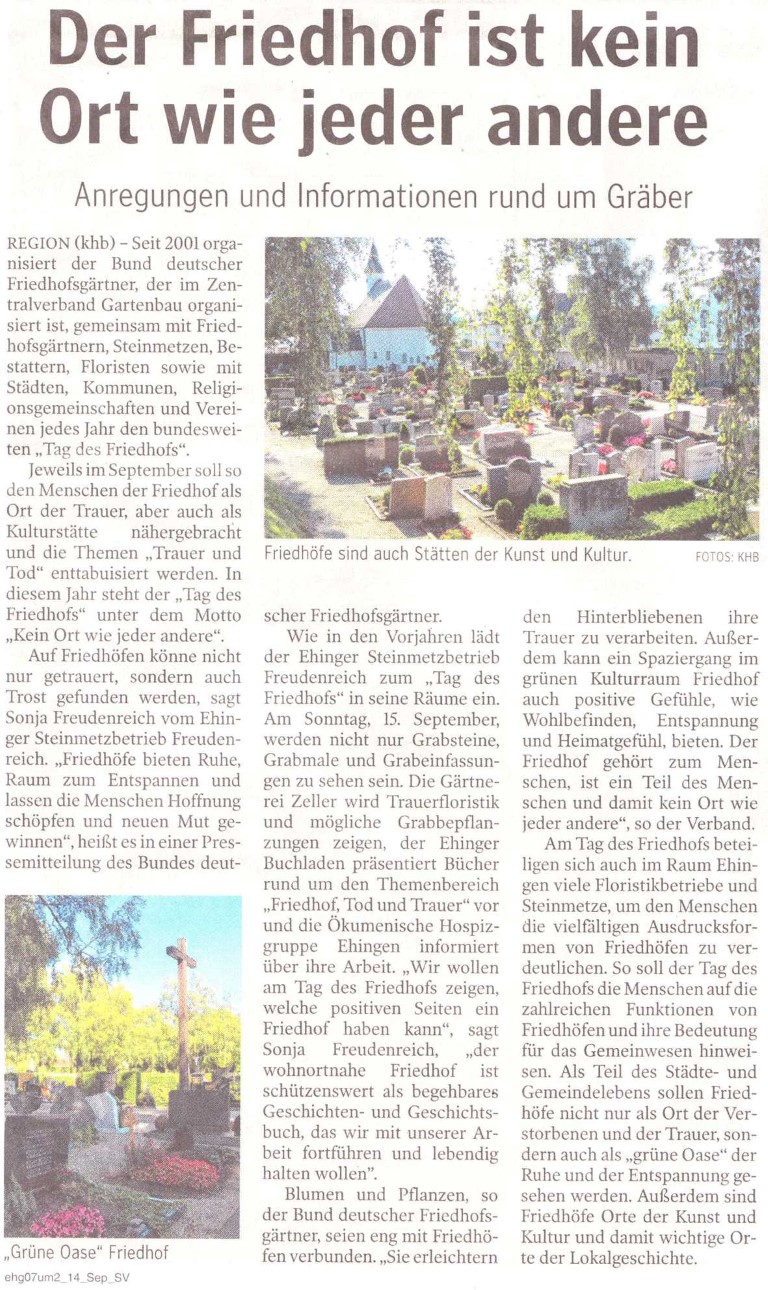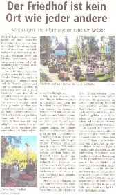 15. September 2013 - Tag des Friedhofs Die Ökumenische Hospizgruppe wird wieder als Ansprechpartner vor Ort sein und der Ehinger Buchladen wird Literatur zum Thema Friedhof/Sterben/Abschiednehmen zusammenstellen. |