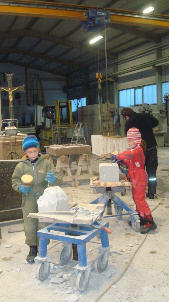 Juni 2013 Jetzt sind wir unter die Instrumentenbauer gegangen. Ein Gong aus edlem Serpentin wird für „Steinklang“ gefertigt. |