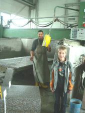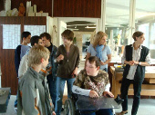 | Mai 2009 - Schmiechtalschule in der Steinmetzwerkstatt Die Schmiechtalschule veranstaltete für ihre Schüler eine Projektwoche. Für das Projekt „Stein“ hatten sich viele Schüler interessiert. Sie sammelten, bearbeiteten, klebten und bemalten Steine. Sogar furiose Improvisationsmusik wurde mit Steinen geschlagen. Ein besonderer Höhepunkt der Woche war der Besuch in unserer Steinmetzwerkstatt. Hier werden Natursteine handwerklich bearbeitet, aber Maschinen können auch helfen: Stapler, Kran, Brückensäge und Presslufthammer, die am Stein im Einsatz waren, beeindruckten die Schüler. |