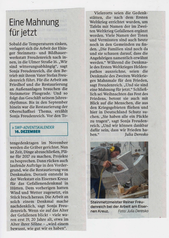 Ehinger Tagblatt 16.12.2016 Südwestpresse-Adventskalender Das 16. Türchen öffnet sich zur Werkstatt Freudenreich in der Ulmer Straße 16.