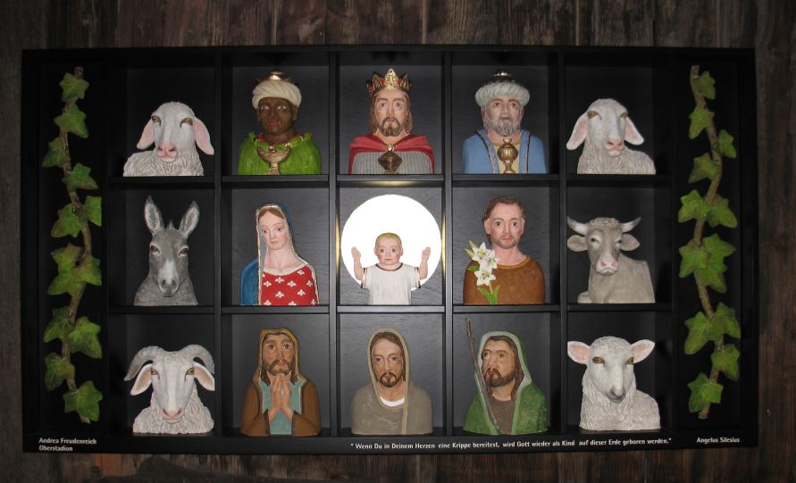 Krippe der Bildhauerin Andrea Freudenreich Krippenmuseum Oberstadion – ein Besuch lohnt sich: nicht nur, aber auch wegen der großen „Setzkastenkrippe“.