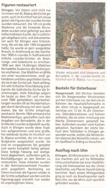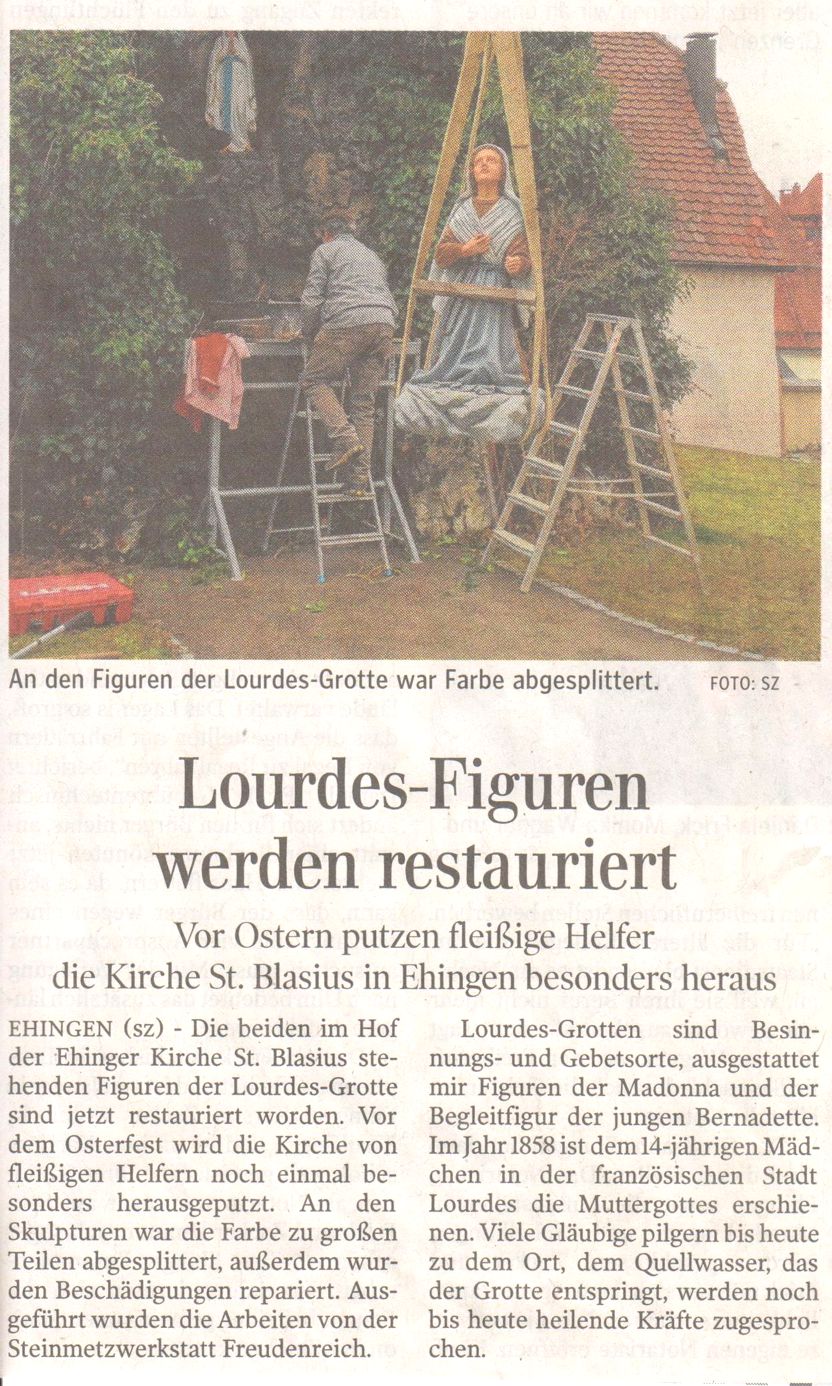 Die Figuren der Lourdesgrotte sind komplett restauriert und werden vor Ostern wieder angebracht, damit an den hohen Feiertagen die Grotte festlich geschmückt ist.